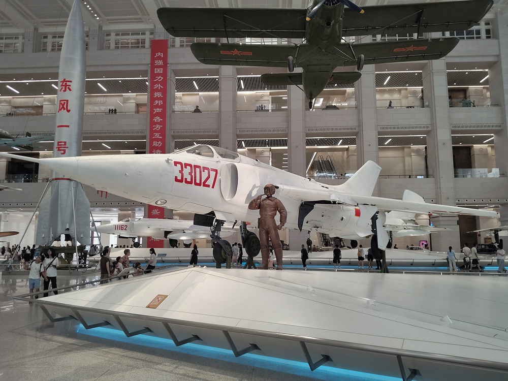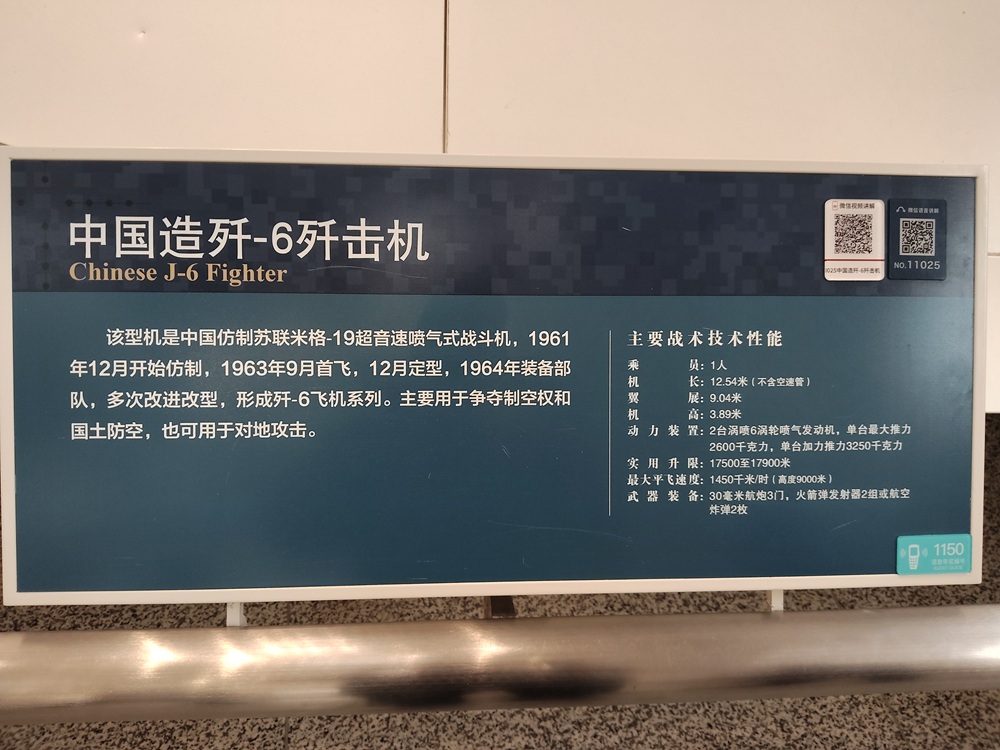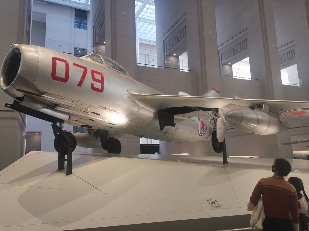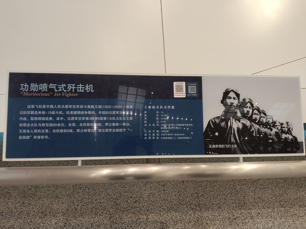 编号079的功勋喷气式歼击机,是志愿军空军战斗英雄王海驾驶过的苏联造米格-15战斗机。王海率领的飞行大队荣立了集体一等功,王海本人则荣立特等功和一等功。战斗机座舱一侧的9颗红星,就是他击落击伤9架敌机的标志。