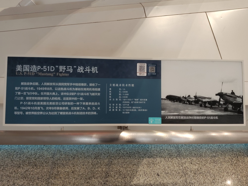 人民空军正式建立之前,以P-51野马战斗机为基础,在南苑机场组建了我军第一支飞行中队。开国大典上,南苑飞行中队的9架P-51野马战斗机,两次飞越天安门上空,接受了党和人民的检阅。军博陈列的P-51D野马战斗机,就是其中的一架。